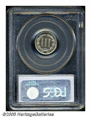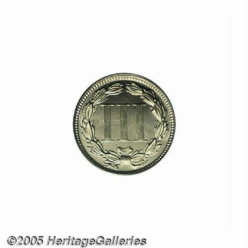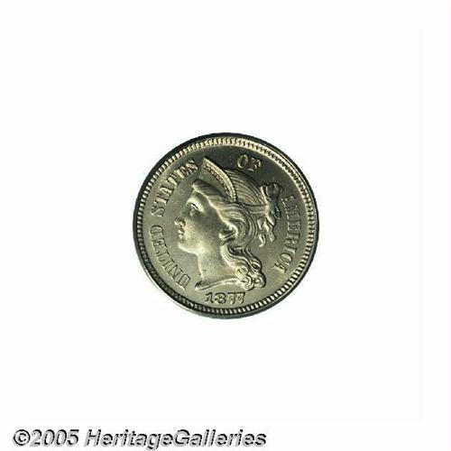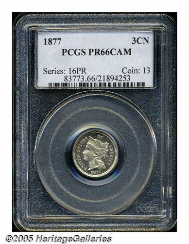 <B>1877<3CN> PR66 Cameo PCGS.</B></I> Breen-2537. This is the variety that Walter Breen described as an "1877/6" overdate, however, we are not convinced of this attribution. Traces of extra metal, or artifacts if you will, are seen just left of the upright of the final 7 in the date. The other three digits show slight doubling. This high grade specimen is essentially brilliant and possesses excellent contrast on the obverse, less so on the reverse.