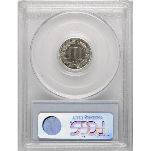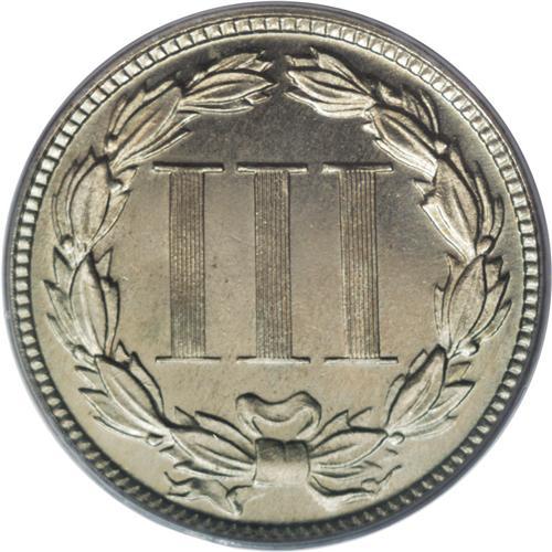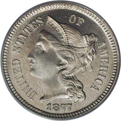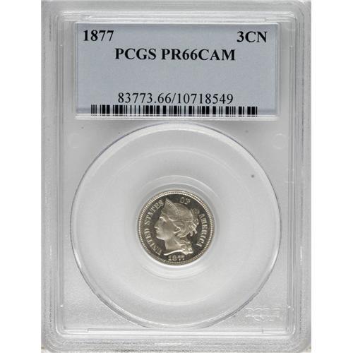 <B>1877 3CN PR66 Cameo PCGS.</B></I> The 1877 three cent nickel has a reported mintage of 510 or more pieces, all proofs, and as such is the key date of the series. As indicated by the large number of specimens that PCGS and NGC have certified, most pieces may have been saved, though a relatively small number of these, again based on the population/census figures, carry the Cameo designation. Whispers of gold-tan color race across impeccably preserved surfaces on both sides of this Premium Gem Cameo. Sharply delineated throughout, as befits a proof strike. All in all, exceptional technical quality and aesthetic appeal. Population: 35 in 66 Cameo, 8 finer (3/07).<BR><BR><b>Shipping:</b> Coins & Currency (<a target="_blank" href="http://www.heritageauctions.com/common/shipping.php">view shipping information</a>)