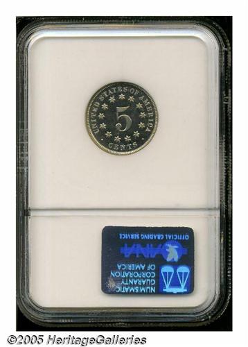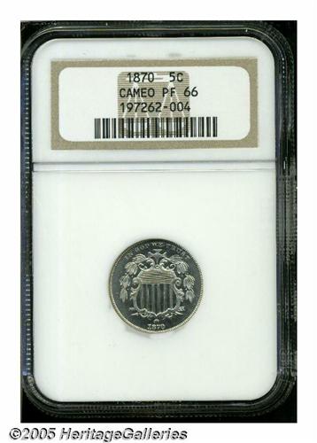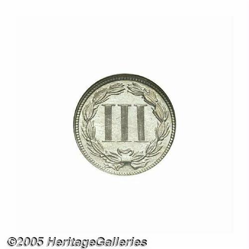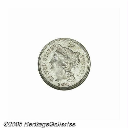 <B>1877<3CN> PR66 NGC.</B></I> Both sides of this impeccably preserved proof-only issue have a thin veil of milky gray and golden patina that contains its flashiness, but does not affect the strong technical merits. Population: 63 in 66, 5 finer (6/05).