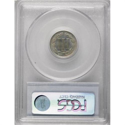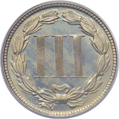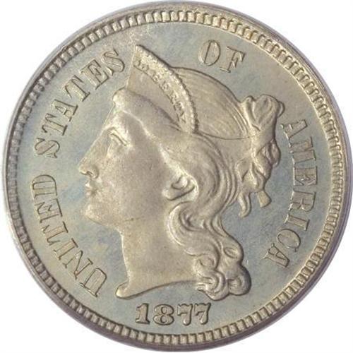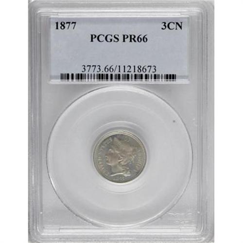 <B>1877 3CN PR66 PCGS.</B></I> There is some possible repunching on the date. This proof-only issue of a mere 510 coins is the key date in the three cent nickel series. A conditionally scarce Premium Gem, the current offering is fully struck and almost perfectly preserved. Free of contact marks or hairlines, the olive-blue surfaces show touches of light tan color on each side. Population: 50 in 66, 3 finer (6/07). <BR><BR><B>Coin Engraver:</B> James B. Longacre<BR><BR><b>Shipping:</b> Coins & Currency (<a target="_blank" href="http://www.heritageauctions.com/common/shipping.php">view shipping information</a>\)
