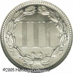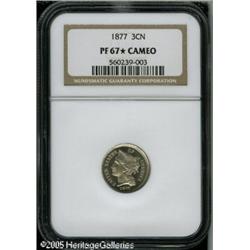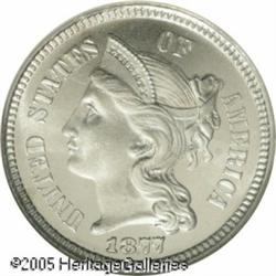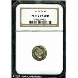 <B>1877 3CN PR67 <img border='0' src='http://www.heritagecoins.com/images/star.gif' width=10 height=10> Cameo NGC.</B></I> Always of interest to collectors because of the miniscule mintage of only 510 pieces, high grade pieces such as this one are very rarely encountered. Brilliant throughout, the surfaces are essentially perfect with no mentionable defects on either side. Deeply mirrored in the fields, the devices have considerable mint frost which gives the coin its remarkable two-toned contrast. This is one of only two PR67 <img border='0' src='http://www.heritagecoins.com/images/star.gif' width=10 height=10> coins that have been certified by NGC with none finer (1/05). Lot:5804