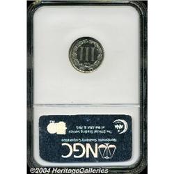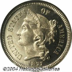 <B>1877<3CN> PR67 Cameo NGC.</B></I> The '77 nickel three-cent piece was only struck in Proof format, and Superb Gem quality survivors are quite elusive today. In fact, PCGS and NGC have combined to certify just 15 examples in Proof-67 Cameo or finer quality. This is a very small percentage of the total number of Superb Gem Proof examples of this date that have been certified by these services. This Cameo Proof has excellent contrast with deeply mirrored pale gray fields accented by a wisp of light gold toning. This is an example of outstanding quality that will please everyone, no matter how fastidious. <BR><BR><B>Important notice:</B> Heritage usually auctions material at the rate of 200-250 lots per hour. On some occasions eBay Live bid software or the Internet may not be able to keep up with the pace of the auction. We recommend placing a realistic absentee bid now as insurance to avoid disappointment. Occasionally the auctioneer may eliminate or reject an eBay Live bid, and the auctioneer may also reopen a lot after the close of the eBay live bidding (usually because we missed an audience bid), and may reject your bid even if it shows you as the winning bidder. By bidding via eBay Live, you agree that Heritage may award the lot to another bidder at its sole discretion under the circumstances described above or any other reasonable circumstances. Since eBay bids are not shown to us until we open the lot on the floor, we treat those bids just like floor bids. In most cases the floor responds before the eBay bid is presented to us, due to Internet lag time, so for consistency we have made it a policy that floor bids are always considered first over tie eBay live bids. Also please note that all Heritage lots purchased through eBay Live carry a 20% Buyer's Premium. Please make sure you read the Terms and Conditions before you bid.