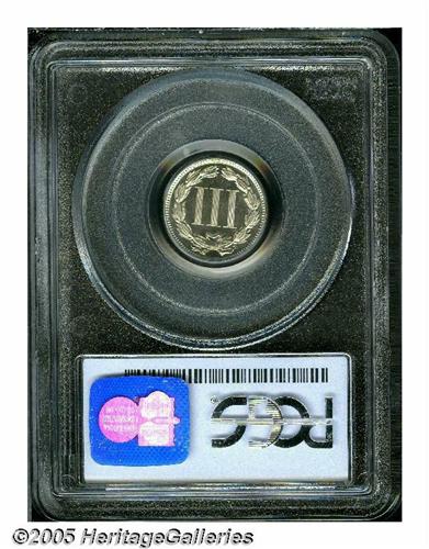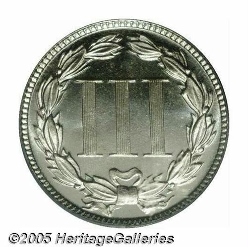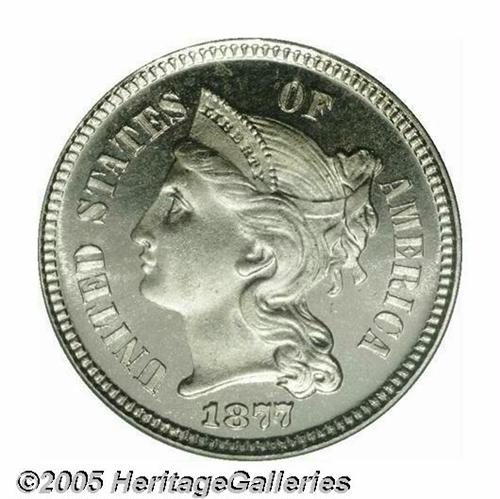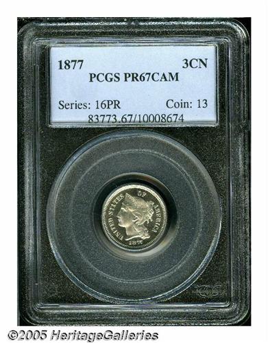 <B>1877<3CN> PR67 Cameo PCGS.</B></I> A Superb specimen that is truly delight to behold. There is no toning on either side--a feature that allows full appreciation of the glowing fields and their degree of contrast with the frosty textured devices. The 1877 is a popular date that boasts the lowest total mintage in the 1865-1889 Three Cent Nickel series. At least 510 pieces were produced, all proofs. Population: 7 in 67, 0 finer (4/05).<BR><I>From The Western Hills Collection.</B></I>