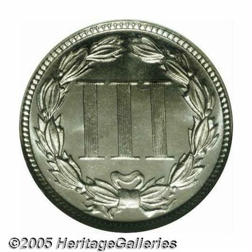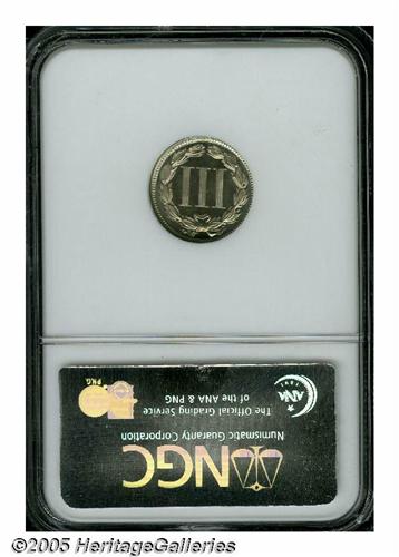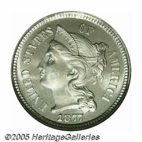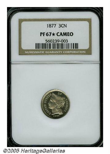 <B>1877<3CN> PR67 <S Cameo NGC.</B></I> Always of interest to collectors because of the miniscule mintage of only 510 pieces, high grade pieces such as this one are seldom encountered. Brilliant throughout, the surfaces are essentially perfect with no mentionable defects on either side. Deeply mirrored in the fields, the devices have considerable mint frost which gives the coin its substantial two-toned contrast. This is one of only two PR67 <S coins that have been certified by NGC with none finer (3/05).