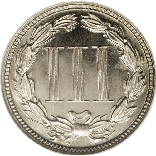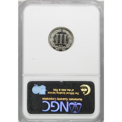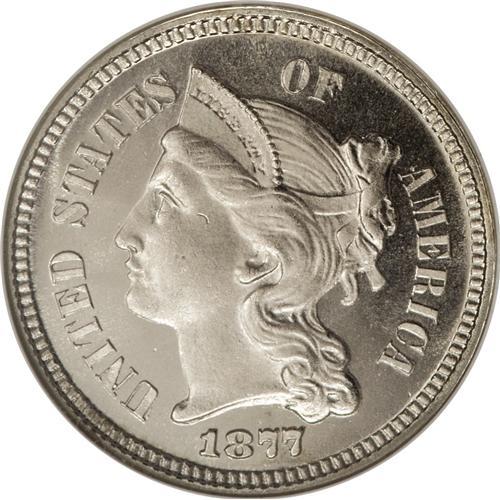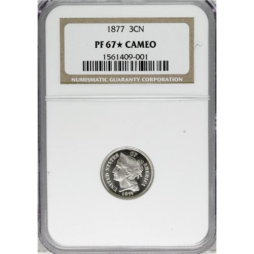 <B>1877 3CN PR67 <img border='0' src='http://www.heritagecoins.com/images/star.gif' width=10 height=10> Cameo NGC.</B></I> This brilliant proof has earned the Cameo designation due to its excellent contrast between the deeply mirrored fields and highly lustrous devices, and is a borderline Ultra Cameo proof. Wisps of pale gold toning are evident around the reverse borders, with all other areas on both sides entirely free of toning. The remarkable eye appeal has generated an additional <img border='0' src='http://www.heritagecoins.com/images/star.gif' width=10 height=10> designation for this proof-only issue. Census: 4 in 67 S, 0 finer (4/07). The only finer example certified by NGC is a PR68 Cameo piece that does not have the additional <img border='0' src='http://www.heritagecoins.com/images/star.gif' width=10 height=10> modifier.<BR><BR><b>Shipping:</b> Coins & Currency (<a target="_blank" href="http://www.heritageauctions.com/common/shipping.php">view shipping information</a>)