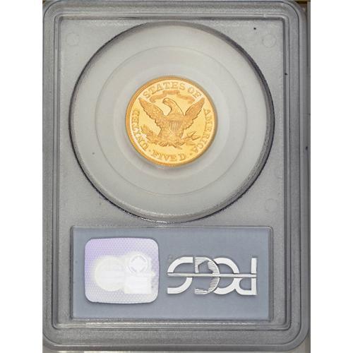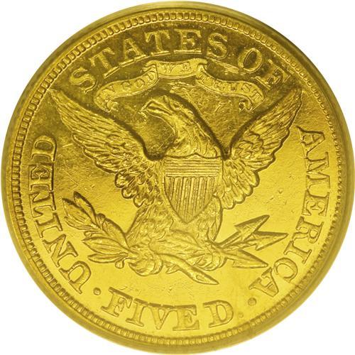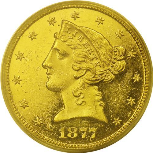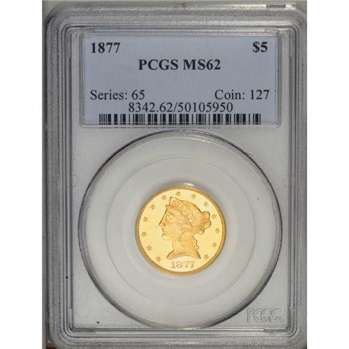 <B>1877<$5> MS62 PCGS.</B></I> Although PCGS does not designate coins as such, this example is unquestionably prooflike, and fully so. Both sides are fully mirrored around lustrous devices, exhibiting excellent contrast. Both sides are also moderately abraded, and these abrasions are reflected in the fields, accounting for the grade assigned. Prooflike examples of this date are seldom encountered. In fact, Mint State examples of this date with any type of surface are seldom encountered, with just five such coins certified by PCGS. This piece is the finest graded by PCGS, and NGC has only certified one better quality coin, an amazing MS66 PL example. The mintage of this date was a mere 1,132 coins, the final low-mintage issue of the decade. Population: 1 in 62, 0 finer (7/06).<BR><I>From The New York Eye Appeal Collection.</B></I>