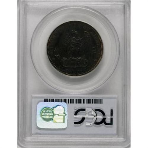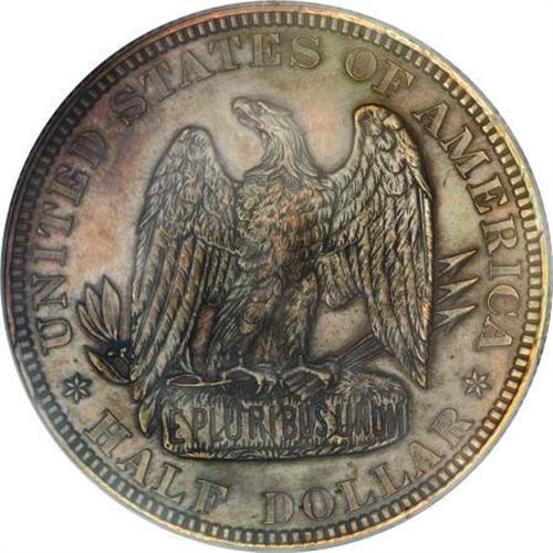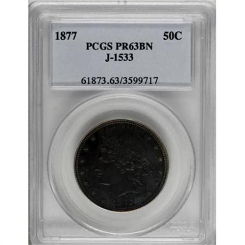 <B>1877 50C Half Dollar, Judd-1533, Pollock-1700, R.8, PR63 Brown PCGS.</B></I> The obverse shows William Barber's head of Liberty with a coronet of wheat and cotton, IN GOD WE TRUST above, the date below, seven stars left and six right. The reverse has an eagle on a pedestal with outstretched wings, E PLURIBUS UNUM on the perch, UNITED STATES OF AMERICA around most of the periphery, and HALF DOLLAR below. Struck in copper with a reeded edge. The date on this pattern shows a notable underpunch of a 1 beneath the 8, which was created when the date was initially started too far to the right. The surfaces are uniformly dark brown with an undertone of deep blue that is evident at certain angles. Lightly cleaned at one time, there are no mentionable contact marks on either side.<BR><I>Ex: Elder's 17th sale; Virgil Brand; The Palace Collection (Farouk), (Sotheby's, 2/54); Dr. J. Hewitt Judd; Numismatic Enterprises (2/66) ?; 1966 ANA (Abe Kosoff); Coronet Coin FPL; Lester Merkin (2/71); Harry Bass, Part I (Bowers and Merena, 5/99), lot 1234.</B></I><BR><BR><b>Shipping:</b> Coins & Currency (<a target="_blank" href="http://www.heritageauctions.com/common/shipping.php">view shipping information</a>)