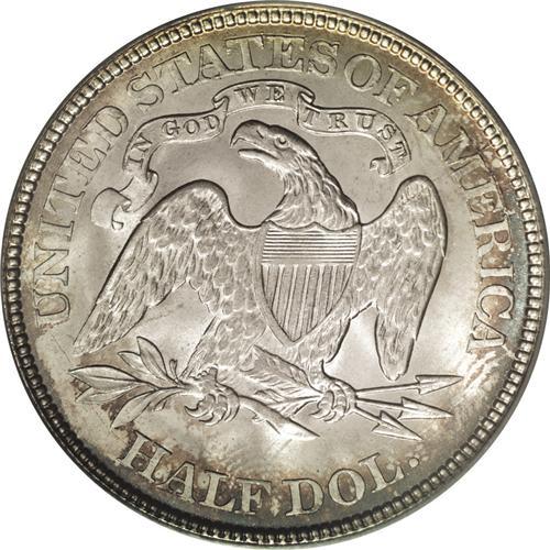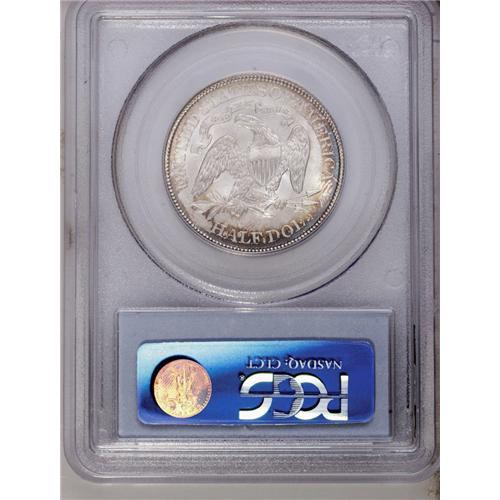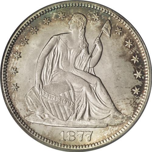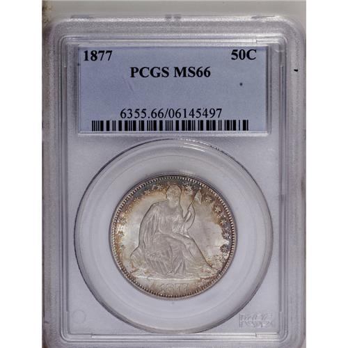 <B>1877<50C> MS66 PCGS.</B></I> Type Two Reverse. This solid Premium Gem exhibits vibrant luster that is overlain with splotches of electric-blue, lavender, and orange-gold patina around the margins. Crisp striking impressions grace the design elements, though the lines on a couple of stripes in the reverse shield merge in places. Minor obverse luster grazes preclude an even higher grade. Population: 17 in 66, 2 finer (6/06).