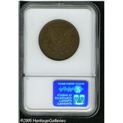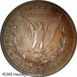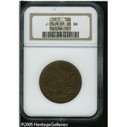 <B>1877 50C Morgan Half Dollar, Judd-1509, Pollock-1663, Low R.7, PR65 Brown NGC.</B></I> As a class, the half dollar patterns of 1877 are among the most desirable of all pattern series. Considering all of the different varieties, there are over 40 different half dollar patterns for the year, and all are extremely rare. Among all of these pattern issues, this is one of the most highly desired, as it is very nearly the final design adopted the following year for regular issue Morgan dollars. Minor differences include the single group of three leaves on the reverse. This Gem Proof has lovely olive brown surfaces with reflective fields. A few slight spots on each side may assist in tracking the pedigree. Lot:9865