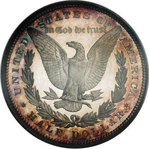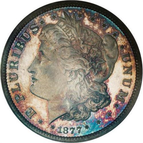 <B>1877 50C Morgan Half Dollar, Judd-1510, Pollock-1674, High R.7, PR65 Cameo PCGS.</B></I> The basic George Morgan design that was adopted for the Morgan dollar in 1878, but with a few notable differences. The date is tiny, and rather than stars, most of the obverse is filled with UNITED STATES OF AMERICA. The reverse elements are the same as the adopted dollar from 1878, but there are slight but noticeable difference that the specialist will immediately recognize. Struck in silver with a reeded edge. Only five pieces are known in silver. This is a fabulous example of this always-popular Morgan design. The fields are deeply mirrored with frosted devices. Rich reddish-golden toning is spread over most of each side with a few areas of light blue at the margins.<BR><I>Ex: J. Hewitt Judd; Lester Merkin (6/1970); Bass I (5/1999), lot 1218; M. Hagen; ANR-Stack's (11/2006).</B></I><BR><BR><b>Shipping:</b> Coins & Currency (<a target="_blank" href="http://www.heritageauctions.com/common/shipping.php">view shipping information</a>)