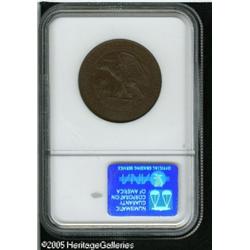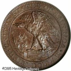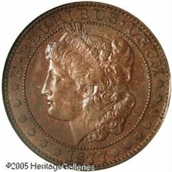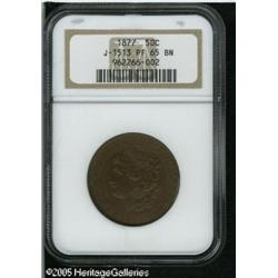 <B>1877 50C Morgan Half Dollar, Judd-1513, Pollock-1677, Low R.7, PR65 Brown NGC.</B></I> This pattern variety combines Morgan's Liberty Head design from his silver dollar with the Defiant Eagle design on the reverse, a design that never made it to regular coinage, but perhaps should have. Over many years, and throughout much of the 19th century, there were many beautiful coin designs issued in the form of patterns that never appeared in actual circulation. How different would collecting be today if some of these pattern issues had actually been chosen for production? This is a wonderful Gem Proof with reflective surfaces and splendid chocolate brown color. Close examination reveals tinges of original mint red color. Lot:9866