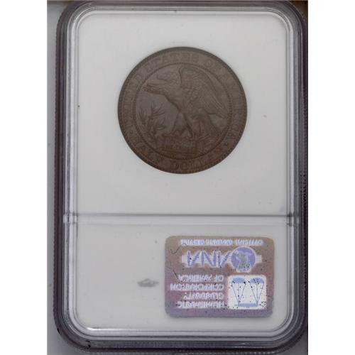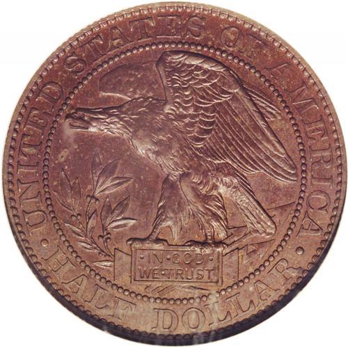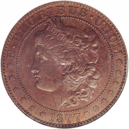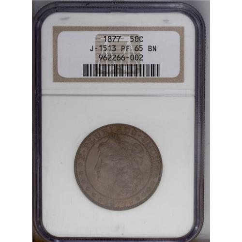 <B>1877 50C Morgan Half Dollar, Judd-1513, Pollock-1677, Low R.7, PR65 Brown NGC.</B></I> This popular George Morgan design features the reduced head from the adopted Morgan dollar from the next year, surrounded by a circle of beads, outside of which is E PLURIBUS UNUM and the date below. On the reverse is the defiant eagle (used later on the Schoolgirl dollar of 1879 and the adopted Sesquicentennial quarter eagle of 1926), surrounded by a circle of beads, outside of which is UNITED STATES OF AMERICA HALF DOLLAR. Struck in copper with a reeded edge.