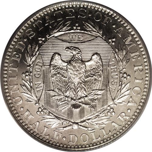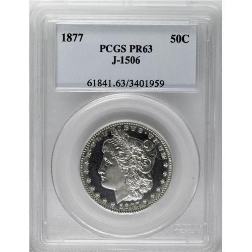 <B>1877 50C Morgan's Liberty Head Half Dollar, Judd-1506, Pollock-1668, High R.7, PR63 PCGS.</B></I> Essentially a miniature of Morgan's famous dollar design, dated 1877. The reverse has an eagle on top of a shield, the motto IN GOD WE TRUST to the left, above, and right of the shield. This entire design is enclosed within a wreath with UNITED STATES OF AMERICA around and HALF DOLLAR below. Struck in silver with a reeded edge.<BR> There are currently just five examples of Judd-1506 known, and these exist from two different obverse dies! Andrew Pollock assigned two different numbers to these dies. Pollock-1660 has a short leaf below the I of PLURIBUS, with three examples known. Pollock-1668 has a long leaf at this location, touching the base of that letter, with just two known pieces. This example, from the Harry Bass Collection, is <B>the Pollock plate coin</B></I> for his number 1668. It is nicely detailed with fully mirrored fields and a trace of hazy toning along the borders. The devices are lustrous with a resultant light cameo contrast, perhaps sufficient for a Cameo designation from PCGS. Both sides exhibit light hairlines that limit the grade. This is an incredible piece, a coin that will be a prized possession by its new owner.<BR> The specialty of collecting 1877 pattern half dollars provides one of the most challenging of all numismatic pursuits. Many cabinets, including some very famous collections, have never had even a single 1877 pattern half dollar. It is estimated that fewer than 200 pattern half dollars of this year exist, and this total population must be divided up among 44 different varieties. The Jones Beach Collection contains seven different examples, a truly remarkable accomplishment.<BR> Through the assistance of Saul Teichman and USPatterns.com, we are pleased to present extensive pedigree information about this coin and the other 1877 half dollar patterns in the present sale.<BR><BR><B>PR65 PCGS. P-1668.</B></I> Dr. Edward Maris (6/1886); Garrett Collection (Stack's, 3/1976); Morris Evans (Bowers and Merena, 8/1998); Superior (7/2003); M. Hagen; R.Kay.<BR><B>PR63 PCGS. The piece offered here. P-1668.</B></I> Ira S. Reed (1941); Monroe Collection; Armand Champa (Bowers and Ruddy, 5/1972), lot 1060; Harry W. Bass, Jr. (Bowers and Merena, 5/1999), lot 1217; Superior (7/1999 FPL); Superior (9/1999); 2002 ANA Sale.<BR><B>PR66 PCGS. P-1660.</B></I> DiBello Collection (Stack's, 5/1970), lot 384; Rudy Sieck (Bowers and Ruddy, 1981 ANA), lot 229; Superior (7/1993).<BR><B>PR65 PCGS. P-1660.</B></I> Dr. J. Hewitt Judd; Stack's (3/1980), lot 714; M. Hagen.<BR><B>Choice Proof. P-1660.</B></I> King Farouk (Sotheby's, 2/1954), lot 1970; Stack's (6/1984), lot 1243; NASAC (6/1986). <BR><I>From The Jones Beach Collection.</B></I><BR><BR><b>Shipping:</b> Coin/Currency (<a target="_blank" href="http://www.heritageauctions.com/common/shipping.php">view shipping information</a>)