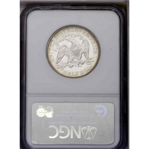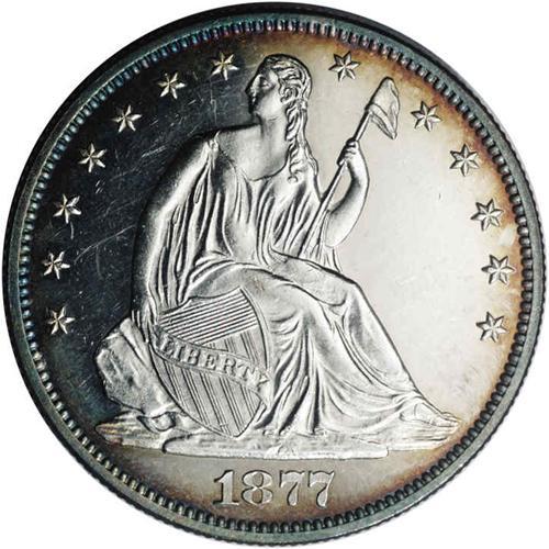 <B>1877<50C> PR62 NGC.</B></I> Type Two Reverse. Invigorating golden-brown, ocean-blue, and ruby-red colors endow the margins of this lightly marked specimen. Generally well struck, only the lower knee and the left (facing) eagle's ankle lack pinpoint detail. The devices are quite frosty, but apparently not sufficiently so to command a Cameo designation from NGC. A scant 510 pieces ensures the scarcity.
