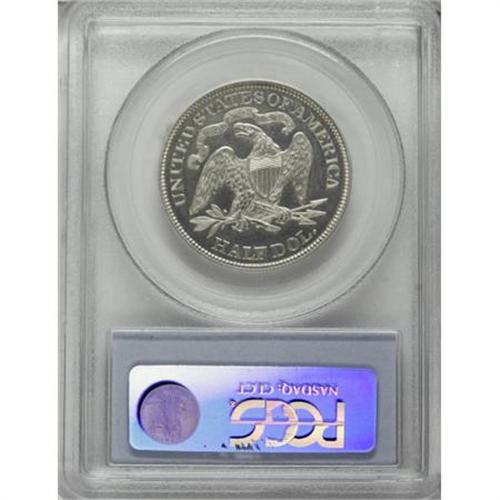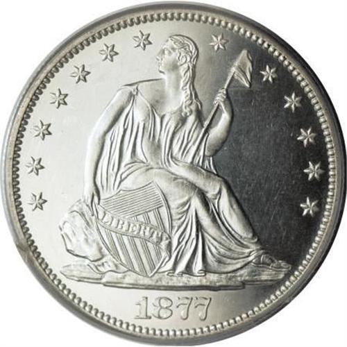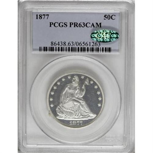 <B>1877 50C PR63 Cameo PCGS. CAC.</B></I> Type Two Reverse. This virtually brilliant specimen is exquisitely struck on all design features aside from the eagle's left (facing) ankle. The field to motif contrast is pronounced. A few wispy hairlines in the obverse field preclude an even higher grade. A mere 510 proof examples were struck. Population: 6 in 63 Cameo, 7 finer (11/07).<BR><I>From The Kallenberg #1 PCGS Registry Set Of Proof Half Dollars.</B></I><BR><BR><b>Shipping:</b> Coins & Currency (<a target="_blank" href="http://www.heritageauctions.com/common/shipping.php">view shipping information</a>)