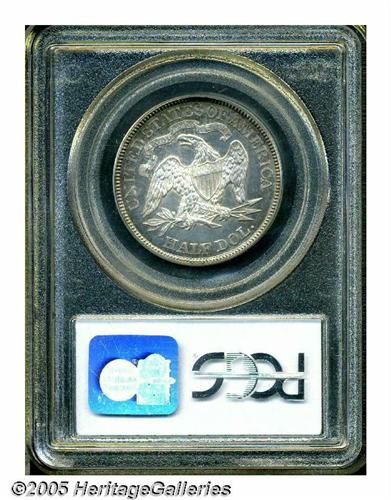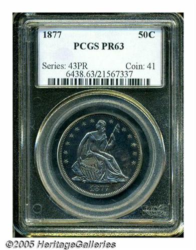 <B>1877<50C> PR63 PCGS.</B></I> Deep apple-green and rose colors consume this sharply struck proof Seated Half. Thorough inspection reveals a few light obverse hairlines. A scant 510 pieces were struck. Population: 45 in 63, 31 finer (5/05).