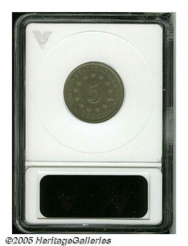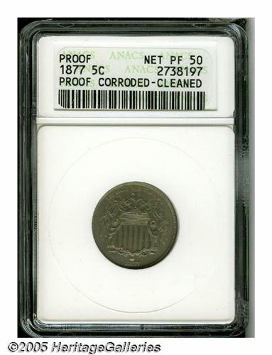 <B>1877<5C>--Corroded, Cleaned--ANACS. Net PR50.</B></I> A well struck but hairlined and somewhat granular walnut-gray example of this scarce proof-only issue, the key to a date set of Nickels.<BR><I>From The Empire State Collection, Part Two.</B></I>