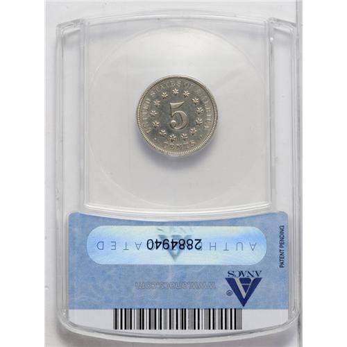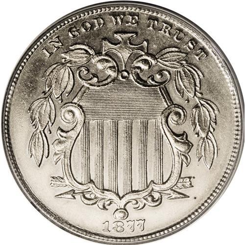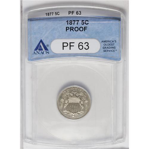 <B>1877<5C> PR63 ANACS.</B></I> Golden and ice-blue highlights grace each side of this pretty proof-only piece, the key to the Shield nickel series and one of only 510 coins struck in this year. A few minuscule surface ticks and a couple of dark toning spots account for the grade. A dark spot is noted next to the large 5 in the center reverse.