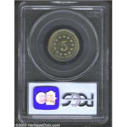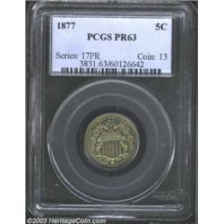 <TABLE cellSpacing=0 cellPadding=0 width="100%" bgColor=#000000 border=0><TBODY><TR><TD width="100%"><TABLE cellSpacing=1 cellPadding=3 width="100%" border=0><TBODY><TR><TD width="100%" bgColor=#79735c><FONT face=arial color=#ffffff size=3><B>Description</B> </FONT></TD></TR><TR><TD width="100%" bgColor=#ffffff><FONT face=arial size=2><B>1877 5C PR63 PCGS.</B></I> The key date in the Shield nickel series, the 1877 is a proof-only issue with a mintage of only 510 pieces. This is one of the most attractive examples we have seen recently of this important date. The surfaces are toned a light sea-green over both sides, and there are no apparent hairlines or handling marks. Each side displays a heavy sprinkling of tiny specks. </FONT></TD></TR></TBODY></TABLE></TD></TR></TBODY></TABLE><BR><A name=PricesRealized></A><TABLE cellSpacing=0 cellPadding=0 width="100%" bgColor=#000000 border=0><TBODY><TR><TD width="100%"><TABLE cellSpacing=1 cellPadding=3 width="100%" border=0><TBODY><TR><TD width="100%" bgColor=#79735c><A name=PR><FONT face=arial color=#ffffff size=3><B>Previous Prices from Heritage Auctions</B> </FONT></A></TD></TR><TR><TD bgColor=#f6f6ed><TABLE cellSpacing=0 cellPadding=0 width="100%" border=1><TBODY><TR><TD align=middle width="33%"><B>Date</B></TD><TD align=middle width="33%"><B>Service</B></TD><TD align=middle width="33%"><B>Price</B></TD></TR><TR bgColor=whitesmoke><TD width="33%"><B>09/01/1998</B></TD><TD width="33%">PCGS</TD><TD width="33%">$1,265.00</TD></TR><TR bgColor=whitesmoke><TD width="33%"><B>06/01/1996</B></TD><TD width="33%">ANACS</TD><TD width="33%">$1,705.00</TD></TR></TBODY></TABLE></TD></TR><TR><TD bgColor=#ffffff><FONT face=arial size=1 ?>PLEASE NOTE: All prices realized reflect the final hammer price PLUS the buyer's premium in auctions that charge a buyer's premium. Each item has a notation at the top of the listing indicating whether that lot included a buyer's premium. Example: A item that sells with a final hammer price of $100 and a 20% buyer's premium will display with a price realized of $120. All information listed is intended to be as accurate as possible, but errors are possible. Please use this guide carefully and inform us of any inaccuracies. </FONT></TD></TR></TBODY></TABLE></TD></TR></TBODY></TABLE><BR><TABLE cellSpacing=0 cellPadding=0 width="100%" bgColor=#000000 border=0><TBODY><TR><TD width="100%"><TABLE cellSpacing=1 cellPadding=3 width="100%" border=0><TBODY><TR><TD width="100%" bgColor=#79735c colSpan=6><FONT face=arial color=#ffffff size=3><B>Price Guide*</B> </FONT></TD></TR><TR bgColor=#f6f6ed><TD align=middle><B>Grade</B> </TD><TD align=middle><B>Coin World<BR>(Trends)</B> </TD><TD align=middle><B>Numismedia<BR>Retail</B> </TD><TD align=middle><B>Numismedia<BR>Wholesale</B> </TD><TD align=middle><B>Coin<BR>Universe</B> </TD><TD align=middle><B>Heritage<BR>Value Index</B> </TD></TR><TR bgColor=#ffffff><TD align=middle>62</TD><TD align=right>---</TD><TD align=right>---</TD><TD align=right>$1,240.00</TD><TD align=right>---</TD><TD align=right>$1,104.17</TD></TR><TR style="FONT-WEIGHT: bold" bgColor=#cccfdd><TD align=middle>63</TD><TD align=right>$1,500.00</TD><TD align=right>---</TD><TD align=right>$1,300.00</TD><TD align=right>$1,700.00</TD><TD align=right>$1,144.17</TD></TR><TR bgColor=#ffffff><TD align=middle>64</TD><TD align=right>$2,000.00</TD><TD align=right>---</TD><TD align=right>$1,495.00</TD><TD align=right>$2,100.00</TD><TD align=right>$1,391.25</TD></TR><TR bgColor=#ffffff><TD colSpan=6><FONT size=1>*All information listed is intended to be as accurate as possible, but errors are possible. No item may be returned or refused based on this information which is provided as a service to our customers. You should contact each pricing source directly to determine the accuracy of this information. </FONT></TD></TR></TBODY></TABLE></TD></TR></TBODY></TABLE><BR><TABLE cellSpacing=0 cellPadding=0 width="100%" bgColor=#000000 border=0><TBODY><TR><TD width="100%"><TABLE cellSpacing=1 cellPadding=3 width="100%" border=0><TBODY><TR><TD width="100%" bgColor=#79735c><FONT face=arial color=#ffffff size=3><B>Population Guide</B> </FONT></TD></TR><TR bgColor=#ffffff><TD align=middle><!-- Begin Output of Population Grid--><TABLE cellSpacing=0 cellPadding=0 width="100%" border=0><TBODY><TR><TD vAlign=center><TABLE cellSpacing=0 width="100%" border=1 cellsadding="3"><TBODY><TR><TD vAlign=center><TABLE cellSpacing=0 cellPadding=3 width="100%" border=1><TBODY><TR><TD vAlign=center align=middle bgColor=#f0f1e8 colSpan=2 <CENTER><FONT face=Arial size=2><B>PCGS Pop </B></FONT><CENTER></CENTER></TD><TD vAlign=center align=middle bgColor=#f0f1e8 colSpan=2><CENTER><FONT face=Arial size=2><B>NGC Pop</B></CENTER></FONT></TD></TR><TR><TD vAlign=center><FONT face=Arial size=2>(63)</FONT> </TD><TD vAlign=center align=right><FONT face=Arial size=2>43</FONT> </TD><TD vAlign=center><FONT face=Arial size=2>(63)</FONT> </TD><TD vAlign=center align=right><FONT face=Arial size=2>21</FONT> </TD></TR><TR><TD vAlign=center><FONT face=Arial size=2>(>63)</FONT> </TD><TD vAlign=center align=right><FONT face=Arial size=2>297</FONT> </TD><TD vAlign=center><FONT face=Arial size=2>(>63)</FONT> </TD><TD vAlign=center align=right><FONT face=Arial size=2>203</FONT> </TD></TR></TBODY></TABLE></TD></TR></TBODY></TABLE></TD></TR></TBODY></TABLE><!-- End Output of Population Grid--> Important notice: Heritage usually auctions material at the rate of 200-250 lots per hour. On some occasions eBay Live bid software or the Internet may not be able to keep up with the pace of the auction. We recommend placing a realistic absentee bid now as insurance to avoid disappointment. Occasionally the auctioneer may eliminate or reject an eBay Live bid, and the auctioneer may also reopen a lot after the close of the eBay live bidding (usually because we missed an audience bid), and may reject your bid even if it shows you as the winning bidder. By bidding via eBay Live, you agree that Heritage may