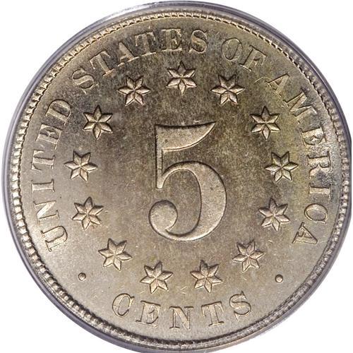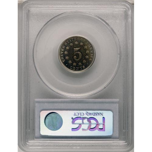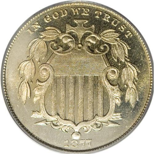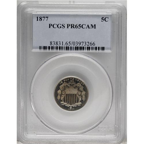 <B>1877 5C PR65 Cameo PCGS.</B></I> Golden-brown blushes dominate the centers, while the borders are nearly untoned. A splendidly struck and flashy piece with reasonable obverse cameo contrast. The proof-only 1877 has a low estimated mintage of 510+ pieces. Population: 26 in 65, 27 finer (2/07).<BR><BR><b>Shipping:</b> Coins & Currency (<a target="_blank" href="http://www.heritageauctions.com/common/shipping.php">view shipping information</a>)