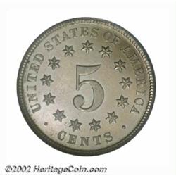 1877 5C PR65 Cameo PCGS. The Mint did not strike any Nickels for circulation in 1877, perhaps because it re-issued 4 million of the 7.1 million Nickels that were redeemed this year. New proof Shield Nickels, however, were produced that year with a total mintage of approximately 875 pieces. We are pleased to be offering several Gem quality survivors of this always popular date. This particular specimen displays a silver-gray appearance. Direct angles reveal appreciable contrast, and the generally smooth surfaces are uncommonly problem-free for an issue that is known for poor planchet stock and inadequate striking quality. A sharply detailed representative for the Shield Nickel date collector. Important notice: We expect to be auctioning lots at the rate of 200-250 per hour. Sometimes eBay Premier live bid software cannot keep up with that pace, so we strongly recommend that you place a realistic proxy bid now as insurance to avoid disappointment. Also please note that all Heritage/CAA lots purchased through eBay Premier carry a 20% Buyer's Premium. Please make sure you read the Terms and Conditions.