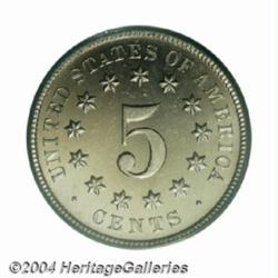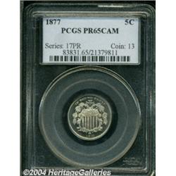 <table><tbody><tr><td><table> <TR><TD width="100%"><TABLE cellSpacing=1 cellPadding=3 width="100%" border=0><TBODY><TR><TD width="100%" bgColor=#79735c><FONT face=arial color=#ffffff size=3><B>Description</B> </FONT></TD></TR><TR><TD width="100%" bgColor=#ffffff><FONT face=arial size=2><B>1877 5C PR65 Cameo PCGS.</B></I> With only 510 proofs and no business strikes issued in 1877, there is considerable date pressure on the few high grade proofs that are still extant today. This is undoubtedly one of the finest from an aesthetic as well as technical viewpoint as the surfaces are immaculate and there is profound field-to-device contrast seen on both sides. Brilliant throughout and very impressive. Population: 6 in 65, 18 finer (10/03). </FONT></TD></TR></TBODY></TABLE></TD></TR></TBODY></TABLE><BR><A name=PricesRealized></A><TABLE cellSpacing=0 cellPadding=0 width="100%" bgColor=#000000 border=0><TBODY><TR><TD width="100%"><TABLE cellSpacing=1 cellPadding=3 width="100%" border=0><TBODY><TR><TD width="100%" bgColor=#79735c><A name=PR><FONT face=arial color=#ffffff size=3><B>Previous Prices from Heritage Auctions</B> </FONT></A></TD></TR><TR><TD bgColor=#f6f6ed><TABLE cellSpacing=0 cellPadding=0 width="100%" border=1><TBODY><TR><TD align=middle width="33%"><B>Date</B></TD><TD align=middle width="33%"><B>Service</B></TD><TD align=middle width="33%"><B>Price</B></TD></TR><TR bgColor=whitesmoke><TD width="33%"><B>11/23/2002</B></TD><TD width="33%">PCGS</TD><TD width="33%">$2,127.50</TD></TR></TBODY></TABLE></TD></TR><TR><TD bgColor=#ffffff><FONT face=arial size=1 ?>PLEASE NOTE: All prices realized reflect the final hammer price PLUS the buyer's premium in auctions that charge a buyer's premium. Each item has a notation at the top of the listing indicating whether that lot included a buyer's premium. Example: A item that sells with a final hammer price of $100 and a 20% buyer's premium will display with a price realized of $120. All information listed is intended to be as accurate as possible, but errors are possible. Please use this guide carefully and inform us of any inaccuracies. </FONT></TD></TR></TBODY></TABLE></TD></TR></TBODY></TABLE><BR><TABLE cellSpacing=0 cellPadding=0 width="100%" bgColor=#000000 border=0><TBODY><TR><TD width="100%"><TABLE cellSpacing=1 cellPadding=3 width="100%" border=0><TBODY><TR><TD width="100%" bgColor=#79735c colSpan=6><FONT face=arial color=#ffffff size=3><B>Price Guide*</B> </FONT></TD></TR><TR bgColor=#f6f6ed><TD align=middle><B>Grade</B> </TD><TD align=middle><B>Coin World<BR>(Trends)</B> </TD><TD align=middle><B>Numismedia<BR>Retail</B> </TD><TD align=middle><B>Numismedia<BR>Wholesale</B> </TD><TD align=middle><B>Coin<BR>Universe</B> </TD><TD align=middle><B>Heritage<BR>Value Index</B> </TD></TR><TR bgColor=#ffffff><TD align=middle>64</TD><TD align=right>---</TD><TD align=right>---</TD><TD align=right>---</TD><TD align=right>---</TD><TD align=right>$1,740.00</TD></TR><TR style="FONT-WEIGHT: bold" bgColor=#cccfdd><TD align=middle>65</TD><TD align=right>---</TD><TD align=right>---</TD><TD align=right>---</TD><TD align=right>---</TD><TD align=right>$2,215.00</TD></TR><TR bgColor=#ffffff><TD align=middle>66</TD><TD align=right>---</TD><TD align=right>---</TD><TD align=right>---</TD><TD align=right>$4,100.00</TD><TD align=right>$3,118.33</TD></TR><TR bgColor=#ffffff><TD colSpan=6><FONT size=1>*All information listed is intended to be as accurate as possible, but errors are possible. No item may be returned or refused based on this information which is provided as a service to our customers. You should contact each pricing source directly to determine the accuracy of this information. </FONT></TD></TR></TBODY></TABLE></TD></TR></TBODY></TABLE><BR><TABLE cellSpacing=0 cellPadding=0 width="100%" bgColor=#000000 border=0><TBODY><TR><TD width="100%"><TABLE cellSpacing=1 cellPadding=3 width="100%" border=0><TBODY><TR><TD width="100%" bgColor=#79735c><FONT face=arial color=#ffffff size=3><B>Population Guide</B> </FONT></TD></TR><TR bgColor=#ffffff><TD align=middle><!-- Begin Output of Population Grid--><TABLE cellSpacing=0 cellPadding=0 width="100%" border=0><TBODY><TR><TD vAlign=center><TABLE cellSpacing=0 width="100%" border=1 cellsadding="3"><TBODY><TR><TD vAlign=center><TABLE cellSpacing=0 cellPadding=3 width="100%" border=1><TBODY><TR><TD vAlign=center align=middle bgColor=#f0f1e8 colSpan=2 <CENTER><FONT face=Arial size=2><B>PCGS Pop </B></FONT><CENTER></CENTER></TD><TD vAlign=center align=middle bgColor=#f0f1e8 colSpan=2><CENTER><FONT face=Arial size=2><B>NGC Pop</B></CENTER></FONT></TD></TR><TR><TD vAlign=center><FONT face=Arial size=2>(65)</FONT> </TD><TD vAlign=center align=right><FONT face=Arial size=2>6</FONT> </TD><TD vAlign=center><FONT face=Arial size=2>(65)</FONT> </TD><TD vAlign=center align=right><FONT face=Arial size=2>13</FONT> </TD></TR><TR><TD vAlign=center><FONT face=Arial size=2>(>65)</FONT> </TD><TD vAlign=center align=right><FONT face=Arial size=2>18</FONT> </TD><TD vAlign=center><FONT face=Arial size=2>(>65)</FONT> </TD><TD vAlign=center align=right><FONT face=Arial size=2>14</FONT> </TD></TR></TBODY></TABLE></TD></TR></TBODY></TABLE></TD></TR></TBODY></TABLE><!-- End Output of Population Grid--></TD></TR></TBODY></TABLE></TD></TR></TBODY></TABLE><BR><TABLE cellSpacing=0 cellPadding=0 width="100%" bgColor=#000000 border=0><TBODY><TR> <font color='#000000'><span style='background-color: #FFFFFF'><td bgcolor='#FFFFFE'> Important notice: Heritage usually auctions material at the rate of 200-250 lots per hour. On some occasions eBay Live bid software or the Internet may not be able to keep up with the pace of the auction. We recommend placing a realistic absentee bid now as insurance to avoid disappointment. Occasionally the auctioneer may eliminate or reject an eBay Live bid, and the auctioneer may also reopen a lot after the close of the eBay live bidding (usually because we missed an audience bid), and may reject your bid even if it shows you 