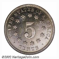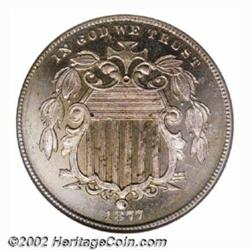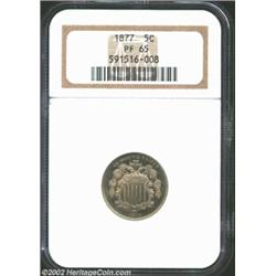 1877 5C PR65 NGC. Original green-gray patina, with a freckle of russet color on the lower left portion of the horizontal shield bars. A razor-sharp Gem that has a nearly pristine obverse. A short lintmark (as struck) is noted west of the uppermost star. The scarcer of the two proof-only issues within the series.From the Ohio Collection. Important notice: We expect to be auctioning lots at the rate of 200-250 per hour. Sometimes eBay Premier live bid software cannot keep up with that pace, so we strongly recommend that you place a realistic proxy bid now as insurance to avoid disappointment. Also please note that all Heritage/CAA lots purchased through eBay Premier carry a 20% Buyer's Premium. Please make sure you read the Terms and Conditions.