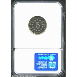 1877 5C PR65 NGC. Original green-gray patina, with a freckle of russet color on the lower left porti