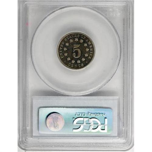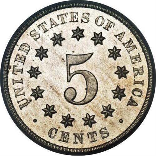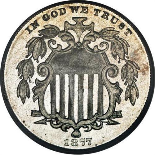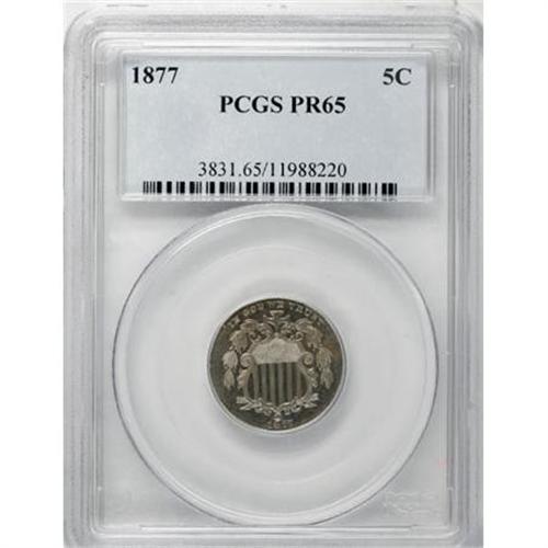 <B>1877 5C PR65 PCGS.</B></I> This key issue has a mintage of only 510 pieces, all of which were proofs. Unlike some 1877 and 1878 nickels, this example displays deeply reflective proof mirrors. The devices are also moderately frosted, but not enough to warrant a Cameo designation. Lightly toned and well-balanced from side to side.<BR><I>From The John Stimson, Sr. Collection, Part Two.</B></I><BR><BR><B>Coin Engraver:</B> James B. Longacre<BR><BR><b>Shipping:</b> Coins & Currency (<a target="_blank" href="http://www.heritageauctions.com/common/shipping.php">view shipping information</a>)