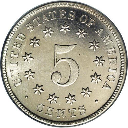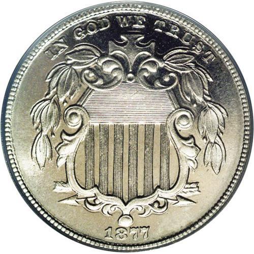 <B>1877<5C> PR66 Cameo ANACS.</B></I> This proof-only issue of 510 pieces is the key date to the Shield nickel series. Luminous surfaces are adorned with whispers of barely discernible powder-blue and beige patina, and the design features are well executed. A few faint hairlines are noted on the reverse. A very pleasing cameo.