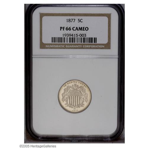 <B>1877<5C> PR66 Cameo NGC.</B></I> Crisply struck throughout and essentially untoned, with bright, highly reflective, nearly pristine surfaces. One of only 510 proofs struck this year. With no business strikes produced, high grade examples are always of interest to collectors. A defect-free and very attractive example of this key issue.