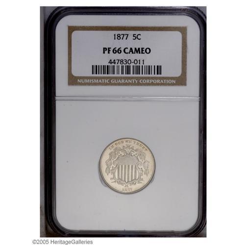 <B>1877<5C> PR66 Cameo NGC.</B></I> Deeply mirrored fields and a completely untoned appearance dominate the outward appearance of both sides. One should not, however, overlook the powerfully impressed, frosty textured devices. Of course, every feature is free of bothersome handling marks, and the eye appeal alone would do justice to an even higher grade. Minor planchet porosity is evident under a loupe, but we stress that this feature is as struck and common to most survivors of this proof issue. Population: 24 in 66 Cameo, 2 finer (10/05).<BR><I>From The Hensley Collection.</B></I>