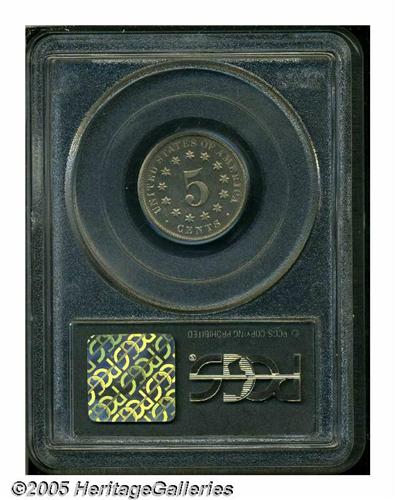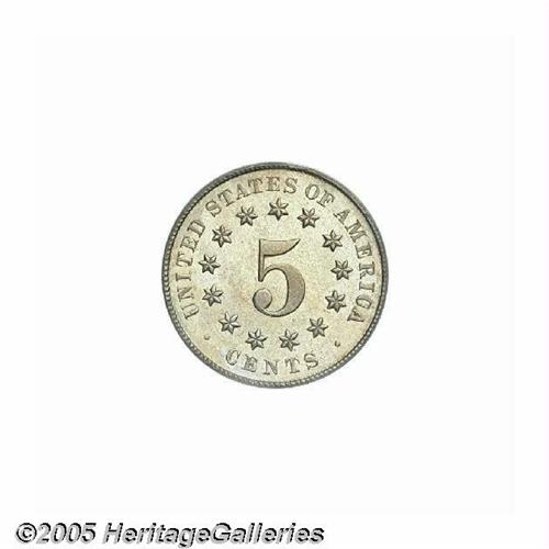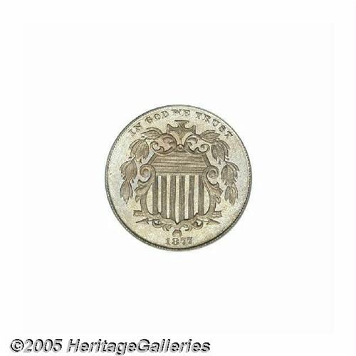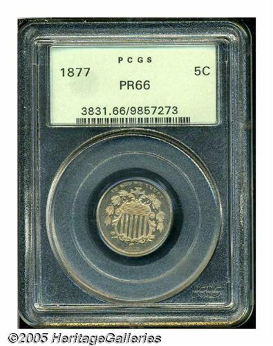 <B>1877<5C> PR66 PCGS.</B></I> 1877 is a curious year for mintages. While silver coins were struck in high quantities at the Philadelphia Mint, the remaining denominations had minimal productions. Within the Shield Nickel series, the 1877 is a proof-only date, which makes it a series key, outshined by only the rare proof 1867 Rays issue. Light apricot and sky-blue colors embrace this exactingly struck and undisturbed older holder premium Gem.