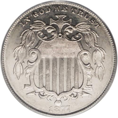 <B>1877 5C PR66 PCGS.</B></I> A highly reflective Premium Gem example of this proof-only issue, long considered the key to the Shield nickel series. Like the three cent nickel from the same year, the mintage is (under) estimated at 510 pieces, and well preserved survivors are both desirable and scarce. Population: 31 in 66, 0 finer (12/06).<BR><BR><b>Shipping:</b> Coin/Currency (<a target="_blank" href="http://www.heritageauctions.com/common/shipping.php">view shipping information</a>)