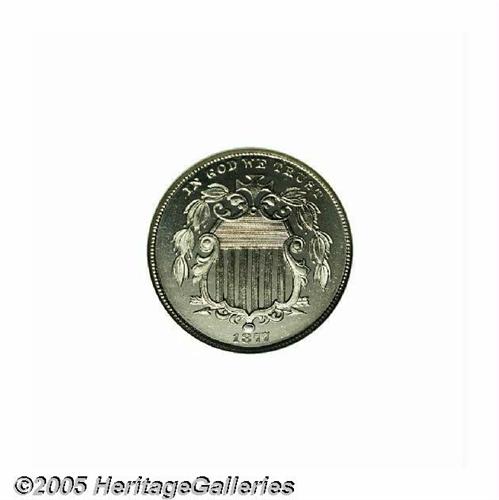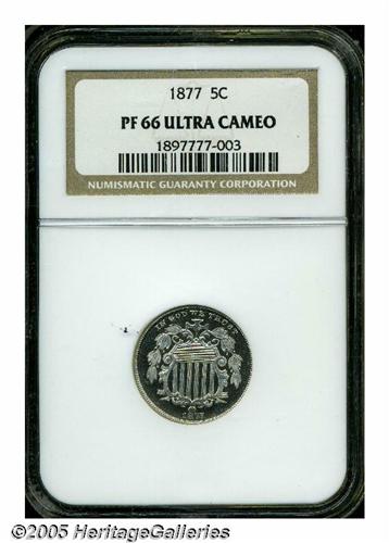 <B>1877<5C> PR66 Ultra Cameo NGC.</B></I> Frosty devices display ready contrast with the flashy fields. The obverse is beautifully preserved, and the reverse has only a small tick or two on the lower field. The tougher of the two proof-only dates within this under appreciated series. Population: 1 in 66 Ultra Cameo, 1 finer (6/05).