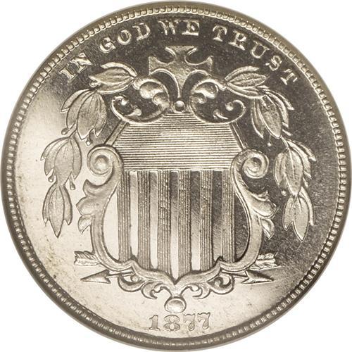 <B>1877<5C> PR67 Cameo NGC.</B></I> A proof-only date with a mintage that was probably in the neighborhood of 1,000 to 1,500 pieces. It was not until 1878 that the Mint actually began recording proof mintages of the minor coinage issues. Over the years, most standard coin catalogs have recorded a mintage of 510 proofs for the minor coinage denominations, borrowing the production figure from the mintage of proof silver coins for the same year. The Mint actually sold minor coin proof sets (consisting of the cent, three-cent, and nickel) in addition to the standard proof sets during these early years, thus the total mintage of the small denomination coins was greater than that of the silver coins. This example of the 1877 Shield nickel is a splendid Cameo proof of superb quality. Both sides are fully brilliant and fully struck with exceptional contrast. Other than some innocent planchet lamination along the obverse border, the surfaces are remarkable without any significant blemishes. Census: 4 in 67, 0 finer (6/06).<BR><I>From The Mulholland Collection.</B></I>