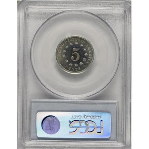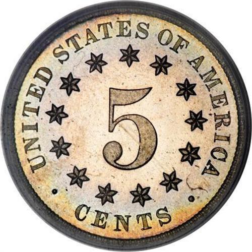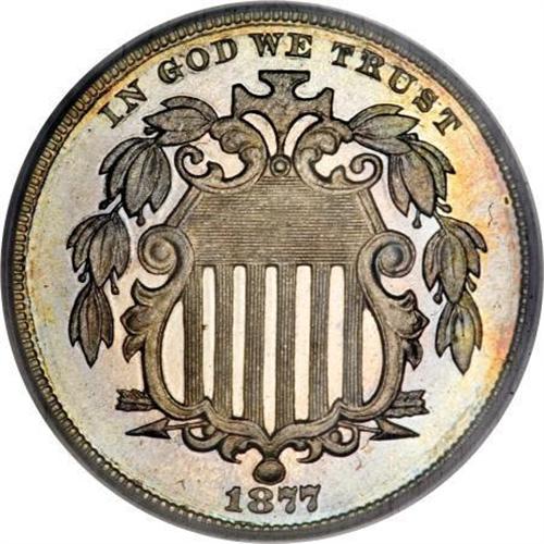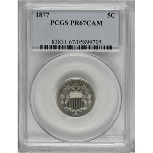<B>1877 5C PR67 Cameo PCGS.</B></I> As the more elusive of two proof-only issues in the Shield nickel series, the 1877 is one of the most important dates for this early five cent design. Mintage figures are speculative, but the <I>Guide Book</B></I> puts the issue's total production at slightly over 510 pieces, which would make it the second-lowest mintage among Shield nickel proofs, behind only the famed 1867 With Rays specimens.<BR> This beautifully preserved and immensely attractive Superb Gem offers moderate reflectivity and mild, yet distinct contrast. This piece's most prominent and desirable attribute is its patina, periwinkle, mint-green, and lemon-gold with occasional flashes of magenta at the margins. While tied for the finest known among Cameo pieces certified by NGC and PCGS (11/07), the outstanding toning on this piece most likely makes it the most visually appealing 1877 Shield nickel known.<BR><BR><b>Shipping:</b> Coins & Currency (<a target="_blank" href="http://www.heritageauctions.com/common/shipping.php">view shipping information</a>)