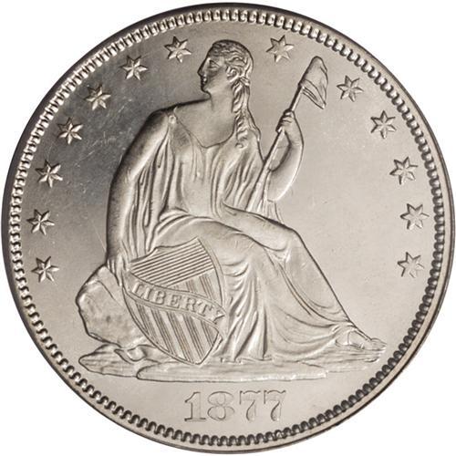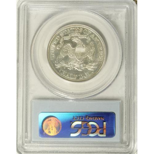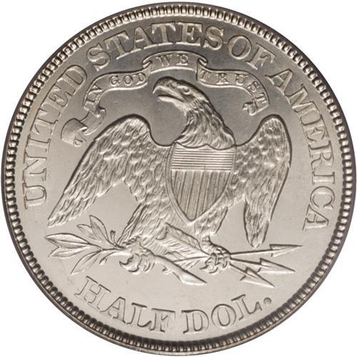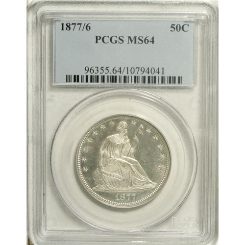 <B>1877/6 50C MS64 PCGS.</B></I> FS-50-1877-301. Type Two Reverse. A flashy and virtually brilliant near-Gem with unusually mark-free fields for the grade. A couple of right-side stars are soft, but the strike is generally soft. Apart from the significance of its variety, this would be a splendid Seated type coin. The underdigit 6 is visible as curves on the crossbar of the final 7. This rare <I>Guide Book</B></I> variety is unpriced above XF. As of (12/06), the present piece is the <I>only</B></I> example certified by PCGS, and none have been certified by NGC. Perhaps the only Mint State survivor, and worthy of a competitive bid.<BR><BR><b>Shipping:</b> Coins & Currency (<a target="_blank" href="http://www.heritageauctions.com/common/shipping.php">view shipping information</a>)
