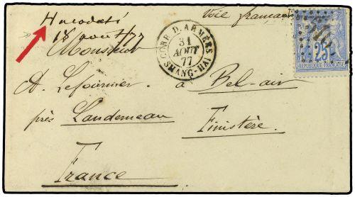 1877 (Aug 18) Cover with manuscript ´Hakodate 18 Aout 1877´ at upper left, franked by Type Sage 1876 25 cent. Blue tied by gros chiffres ´5105´ of French PO in Shanghai. Centrally struck "CORR. D.ARMÉES / SHANG-HAI" (Aug 31) in black and reverse with ´Shang-Hai/Chine´ cds (Sept 9) and five French transit: carried on Paquebot ´Mei-Kong´ to Marseille (Oct 20). A remarkable and extremely rare cover which would benefit by being opened for display. Scott 81.