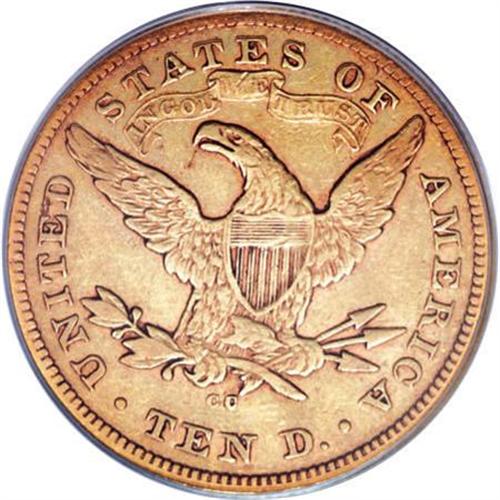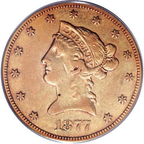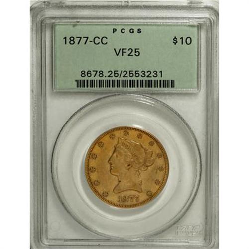 <B>1877-CC $10 VF25 PCGS.</B></I> This orange-gold rare date Carson City ten is certainly to be of interest to specialists of the legendary Western facility. The eagle's wings are surprisingly detailed for the grade, and some mint luster remains. The fields are smooth, but a couple of marks on the face require mention. Only 3,332 pieces were struck. Certified in a green label holder.<BR><BR><B>Coin Engraver:</B> Christian Gobrecht<BR><BR><b>Shipping:</b> Coins & Currency (<a target="_blank" href="http://www.heritageauctions.com/common/shipping.php">view shipping information</a>)