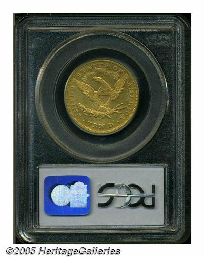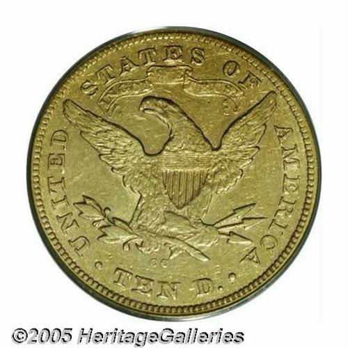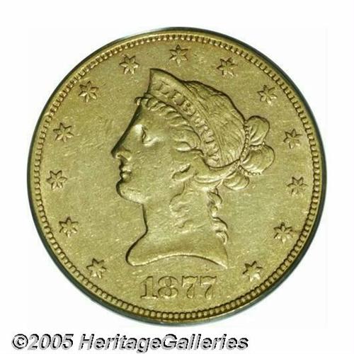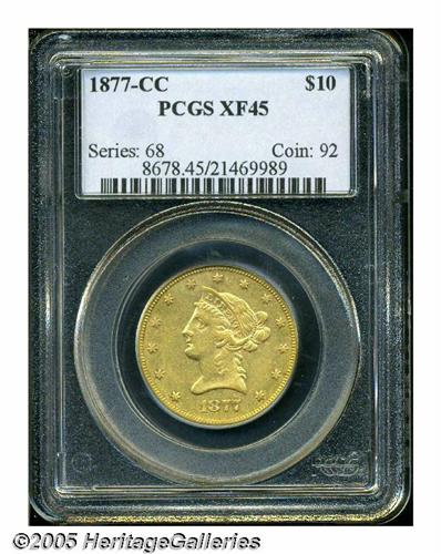 <B>1877-CC<$10> XF45 PCGS.</B></I> Although Doug Winter asserts that a small hoard of 1877-CC eagles may have existed at one time, these pieces were undoubtedly in lower grades as the issue is difficult to locate above the VF level. NGC and PCGS combined report only 7 examples in XF 45 with 11 finer (4/05). Rich copper-gold highlights blanket the otherwise bright, yellow-gold features. Considerable mint luster is still evident in the protected areas and the scattered abrasions hardly detract from the overall pleasing eye appeal.
