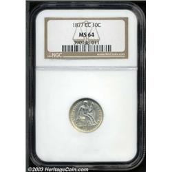 <TABLE cellSpacing=0 cellPadding=0 width="100%" bgColor=#000000 border=0><TBODY><TR><TD width="100%"><TABLE cellSpacing=1 cellPadding=3 width="100%" border=0><TBODY><TR><TD width="100%" bgColor=#79735c><FONT face=arial color=#ffffff size=3><B>Description</B> </FONT></TD></TR><TR><TD width="100%" bgColor=#ffffff><FONT face=arial size=2><B>1877-CC 10C MS64 NGC.</B></I> Undistracting gold color covers the surfaces of this seemingly conservatively graded near-Gem. While unable to identify this piece as a specific variety, the date is repunched at the bottom of the first 7 and more distinctly below the base of the crossbar on the second 7. </FONT></TD></TR></TBODY></TABLE></TD></TR></TBODY></TABLE><BR><A name=PricesRealized></A><TABLE cellSpacing=0 cellPadding=0 width="100%" bgColor=#000000 border=0><TBODY><TR><TD width="100%"><TABLE cellSpacing=1 cellPadding=3 width="100%" border=0><TBODY><TR><TD width="100%" bgColor=#79735c><A name=PR><FONT face=arial color=#ffffff size=3><B>Previous Prices from Heritage Auctions</B> </FONT></A></TD></TR><TR><TD bgColor=#f6f6ed><TABLE cellSpacing=0 cellPadding=0 width="100%" border=1><TBODY><TR><TD align=middle width="33%"><B>Date</B></TD><TD align=middle width="33%"><B>Service</B></TD><TD align=middle width="33%"><B>Price</B></TD></TR><TR bgColor=whitesmoke><TD width="33%"><B>04/27/2002</B></TD><TD width="33%">PCGS</TD><TD width="33%">$603.75</TD></TR><TR bgColor=whitesmoke><TD width="33%"><B>01/13/2002</B></TD><TD width="33%">PCGS</TD><TD width="33%">$587.65</TD></TR><TR bgColor=whitesmoke><TD width="33%"><B>04/24/1999</B></TD><TD width="33%">PCGS</TD><TD width="33%">$352.00</TD></TR><TR bgColor=whitesmoke><TD width="33%"><B>01/04/1995</B></TD><TD width="33%">PCGS</TD><TD width="33%">$467.50</TD></TR><TR bgColor=whitesmoke><TD width="33%"><B>04/27/2002</B></TD><TD width="33%">NGC</TD><TD width="33%">$488.75</TD></TR><TR bgColor=whitesmoke><TD width="33%"><B>02/23/2001</B></TD><TD width="33%">NGC</TD><TD width="33%">$460.00</TD></TR><TR bgColor=whitesmoke><TD width="33%"><B>07/29/1997</B></TD><TD width="33%">NGC</TD><TD width="33%">$253.00</TD></TR><TR bgColor=whitesmoke><TD width="33%"><B>05/02/1997</B></TD><TD width="33%">NGC</TD><TD width="33%">$319.00</TD></TR><TR bgColor=whitesmoke><TD width="33%"><B>08/13/1996</B></TD><TD width="33%">NGC</TD><TD width="33%">$319.00</TD></TR><TR bgColor=whitesmoke><TD width="33%"><B>07/27/1993</B></TD><TD width="33%">NGC</TD><TD width="33%">$495.00</TD></TR><TR bgColor=whitesmoke><TD width="33%"><B>09/21/1996</B></TD><TD width="33%">NGC</TD><TD width="33%">$440.00</TD></TR></TBODY></TABLE></TD></TR><TR><TD bgColor=#ffffff><FONT face=arial size=1 ?>PLEASE NOTE: All prices realized reflect the final hammer price PLUS the buyer's premium in auctions that charge a buyer's premium. Each item has a notation at the top of the listing indicating whether that lot included a buyer's premium. Example: A item that sells with a final hammer price of $100 and a 20% buyer's premium will display with a price realized of $120. All information listed is intended to be as accurate as possible, but errors are possible. Please use this guide carefully and inform us of any inaccuracies. </FONT></TD></TR></TBODY></TABLE></TD></TR></TBODY></TABLE><BR><TABLE cellSpacing=0 cellPadding=0 width="100%" bgColor=#000000 border=0><TBODY><TR><TD width="100%"><TABLE cellSpacing=1 cellPadding=3 width="100%" border=0><TBODY><TR><TD width="100%" bgColor=#79735c colSpan=6><FONT face=arial color=#ffffff size=3><B>Price Guide*</B> </FONT></TD></TR><TR bgColor=#f6f6ed><TD align=middle><B>Grade</B> </TD><TD align=middle><B>Coin World<BR>(Trends)</B> </TD><TD align=middle><B>Numismedia<BR>Retail</B> </TD><TD align=middle><B>Numismedia<BR>Wholesale</B> </TD><TD align=middle><B>Coin<BR>Universe</B> </TD><TD align=middle><B>Heritage<BR>Value Index</B> </TD></TR><TR bgColor=#ffffff><TD align=middle>63</TD><TD align=right>$275.00</TD><TD align=right>$378.00</TD><TD align=right>$315.00</TD><TD align=right>$260.00</TD><TD align=right>$208.88</TD></TR><TR style="FONT-WEIGHT: bold" bgColor=#cccfdd><TD align=middle>64</TD><TD align=right>$600.00</TD><TD align=right>$594.00</TD><TD align=right>$475.00</TD><TD align=right>$325.00</TD><TD align=right>$400.56</TD></TR><TR bgColor=#ffffff><TD align=middle>65</TD><TD align=right>---</TD><TD align=right>---</TD><TD align=right>$840.00</TD><TD align=right>$1,300.00</TD><TD align=right>$989.50</TD></TR><TR bgColor=#ffffff><TD colSpan=6><FONT size=1>*All information listed is intended to be as accurate as possible, but errors are possible. No item may be returned or refused based on this information which is provided as a service to our customers. You should contact each pricing source directly to determine the accuracy of this information. </FONT></TD></TR></TBODY></TABLE></TD></TR></TBODY></TABLE><BR><TABLE cellSpacing=0 cellPadding=0 width="100%" bgColor=#000000 border=0><TBODY><TR><TD width="100%"><TABLE cellSpacing=1 cellPadding=3 width="100%" border=0><TBODY><TR><TD width="100%" bgColor=#79735c><FONT face=arial color=#ffffff size=3><B>Population Guide</B> </FONT></TD></TR><TR bgColor=#ffffff><TD align=middle><!-- Begin Output of Population Grid--><TABLE cellSpacing=0 cellPadding=0 width="100%" border=0><TBODY><TR><TD vAlign=center><TABLE cellSpacing=0 width="100%" border=1 cellsadding="3"><TBODY><TR><TD vAlign=center><TABLE cellSpacing=0 cellPadding=3 width="100%" border=1><TBODY><TR><TD vAlign=center align=middle bgColor=#f0f1e8 colSpan=2 <CENTER><FONT face=Arial size=2><B>PCGS Pop </B></FONT><CENTER></CENTER></TD><TD vAlign=center align=middle bgColor=#f0f1e8 colSpan=2><CENTER><FONT face=Arial size=2><B>NGC Pop</B></CENTER></FONT></TD></TR><TR><TD vAlign=center><FONT face=Arial size=2>(64)</FONT> </TD><TD vAlign=center align=right><FONT face=Arial size=2>50</FONT> </TD><TD vAlign=center><FONT face=Arial size=2>(64)</FONT> </TD><TD vAlign=center align=right><FONT face=Arial size=2>68</FONT> </TD></TR><TR><TD vAlign=center>
