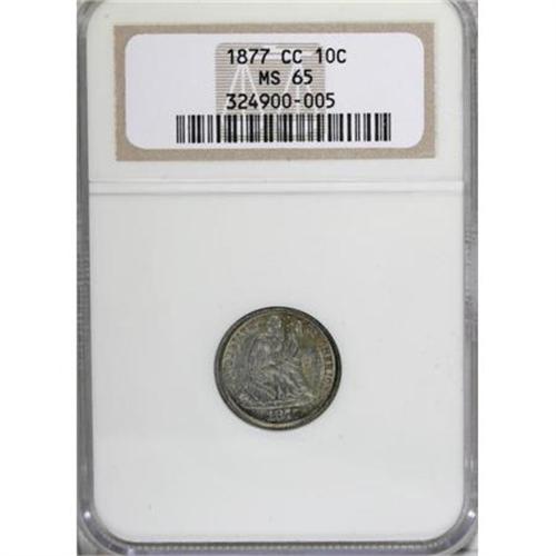 <B>1877-CC 10C MS65 NGC.</B></I> Rich rose-orange, gold, and forest-green patina drapes the softly lustrous surfaces of this Gem. Well struck and carefully preserved, a delightful example of this comparatively available Carson City minor.<BR><BR><B>Coin Engraver:</B> Christian Gobrecht<BR><BR><b>Shipping:</b> Coins & Currency (<a target="_blank" href="http://www.heritageauctions.com/common/shipping.php">view shipping information</a>)