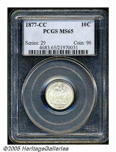 <B>1877-CC<10C> MS65 PCGS.</B></I> Type Two Reverse. Lustrous, faintly matte surfaces with a few minute scattered marks and ample eye appeal.