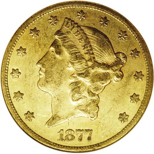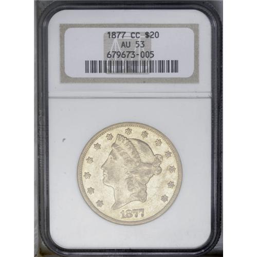 <B>1877-CC<$20> AU53 NGC.</B></I> Not overly difficult to locate in XF and lower AU grades, the 1877-CC shows its true rarity above the AU55 level. This example displays a strike that is typically sharp for a Type Three double eagle, and the color is a pleasingly original greenish-gold with a slightly dirty appearance on the highpoints. While the typical '77-CC double eagle is heavily abraded, this coin is quite modestly marked. Worthy of a serious bid. <BR><BR><B>Important notice:</B> Heritage usually auctions material at the rate of 200-250 lots per hour. On some occasions eBay Live bid software or the Internet may not be able to keep up with the pace of the auction. We recommend placing a realistic absentee bid now as insurance to avoid disappointment. Occasionally the auctioneer may eliminate or reject an eBay Live bid, and the auctioneer may also reopen a lot after the close of the eBay live bidding (usually because we missed an audience bid), and may reject your bid even if it shows you as the winning bidder. By bidding via eBay Live, you agree that Heritage may award the lot to another bidder at its sole discretion under the circumstances described above or any other reasonable circumstances. Since eBay bids are not shown to us until we open the lot on the floor, we treat those bids just like floor bids. In most cases the floor responds before the eBay bid is presented to us, due to Internet lag time, so for consistency we have made it a policy that floor bids are always considered first over tie eBay live bids. Also please note that all Heritage lots purchased through eBay Live carry a 20% Buyer's Premium. Please make sure you read the Terms and Conditions before you bid. This lot is being auctioned in conjunction with a live floor auction by Heritage Galleries & Auctioneers. All final auction and invoice information will be supplied by Heritage Galleries & Auctioneers, and all other information should be considered preliminary. Lot:4266 <BR><BR><B>Winning Notification and Billing:</B> After the FINAL session in this auction is complete, Heritage will send e-mail and snail mail invoices. This process normally takes several days. All final auction and invoice information will be supplied by Heritage Galleries & Auctioneers, and all other information should be considered preliminary. <BR><BR>This auction will be conducted on a live auction floor and over the Internet through eBay Live. If you choose to place an absentee bid, please take a moment to <font color='#0000ff'><u><a href='http://pages.ebay.com/liveauctions/help/before/laabsentee.html'>learn how eBay Live absentee bidding works</a></u></font><font color='#000000'>