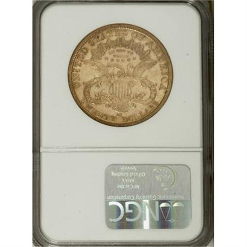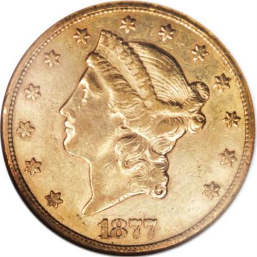 <B>1877-CC $20 AU53 NGC.</B></I> Doug Winter, in his <I>Gold Coins of the Old West</B></I>, ranks the 1877-CC as the ninth rarest of the 19 Carson City double eagle issues. Most survivors are found in VF and XF condition, with true AU examples scarce. Even with the repatriation of several overseas hoards in recent decades, the 1877-CC twenty is rarely seen in Mint State. For this reason, most collectors must settle for attractive AU examples of this date. The current coin provides that opportunity. Displaying delicate yellow-gold coloration and sufficiently lustrous surfaces, this example is visually pleasing. The abraded surfaces found on this example are typical for the issue. NGC has graded 78 examples in AU53 (6/07).<BR><BR><b>Shipping:</b> Coins & Currency (<a target="_blank" href="http://www.heritageauctions.com/common/shipping.php">view shipping information</a>)
