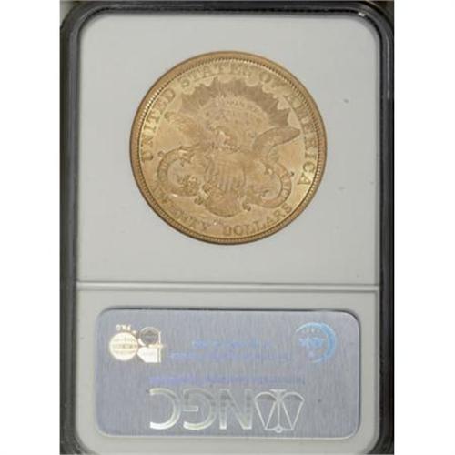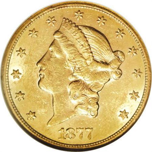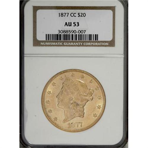 <B>1877-CC $20 AU53 NGC.</B></I> This was the first Type Three double eagle issue produced at the Carson City Mint, with the denomination on the lower reverse changed from "Twenty D." to "Twenty Dollars". This example displays thick mint frost over both sides, which is unusual for an AU coin of any type. A slight degree of wear is noted on the back on Liberty's hair bun, and typically heavy bagmarks (for the issue) are observed on both sides.<BR><BR><B>Coin Engraver:</B> James B. Longacre<BR><BR><b>Shipping:</b> Coins & Currency (<a target="_blank" href="http://www.heritageauctions.com/common/shipping.php">view shipping information</a>)