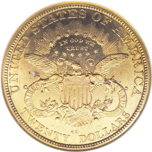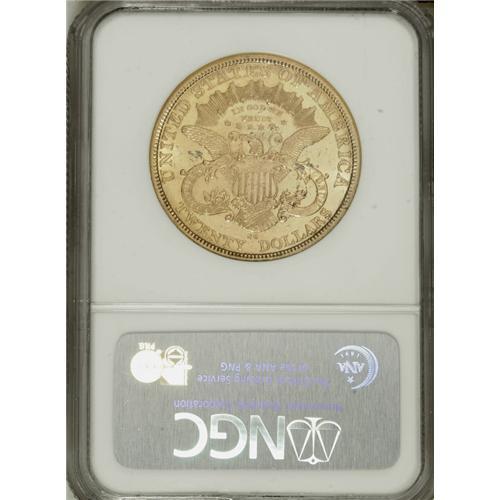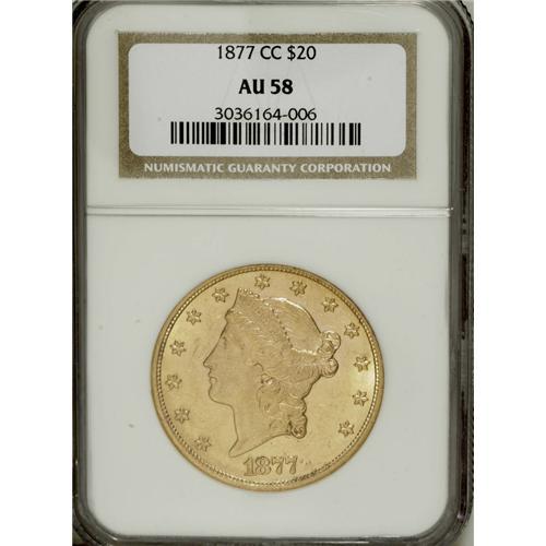 <B>1877-CC $20 AU58 NGC.</B></I> This is the first year of the new design modification with the denomination entirely spelled out, known as Type Three, and examples from Carson City are at once rare and desirable. The mintage was a respectable 42,565 coins and many examples survive in the VF to AU grades, but nearly all have heavy abrasions from years spent in canvas bags with hundreds of other pieces. Each time a bag was moved, the individual coins would received additional abrasions. This example, a splendid near-Mint piece, has prooflike surfaces and sharp design features with essentially mark free surfaces. The reverse has a small, darkish planchet imperfection that should serve as a pedigree marker.<BR><BR><b>Shipping:</b> Coins & Currency (<a target="_blank" href="http://www.heritageauctions.com/common/shipping.php">view shipping information</a>)