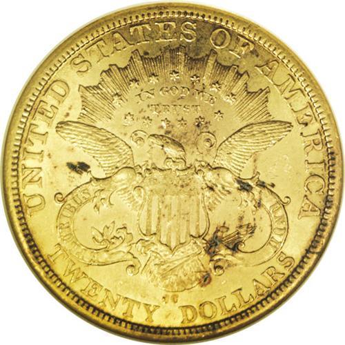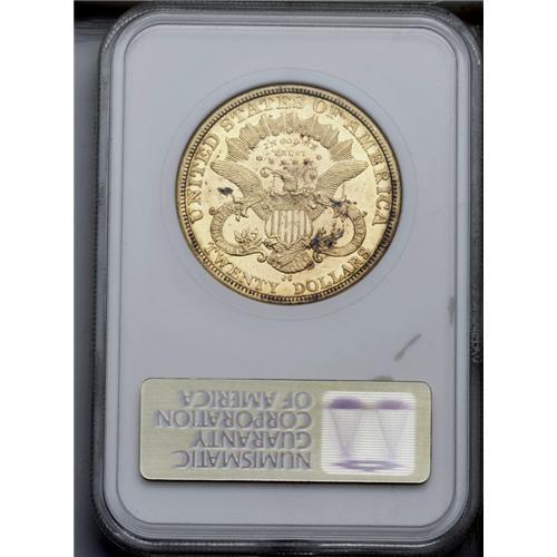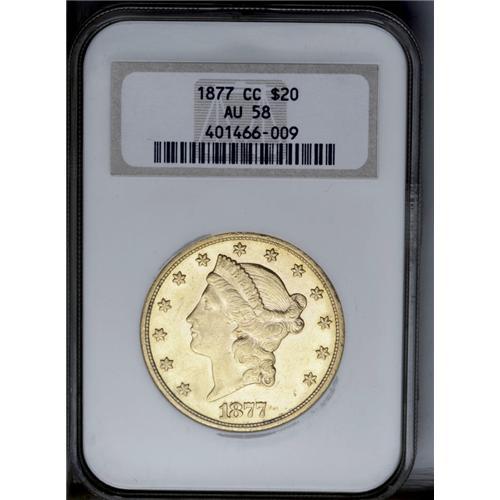 <B>1877-CC<$20> AU58 NGC.</B></I> This issue is somewhat scarce at any grade level, with an original mintage of just 42,565 pieces. Problem-free AU examples are somewhat expensive, with true Mint State coins simply out of the range of the average collector's budget. This example has decidedly prooflike fields and pleasingly rich coloration. A few minor blemishes are noted, along with wispy hairlines and a few scattered bits of discoloration on the reverse. Perhaps a shipwreck survivor.<BR><I>From The Clifton Rodenburg Collection.</B></I>
