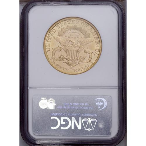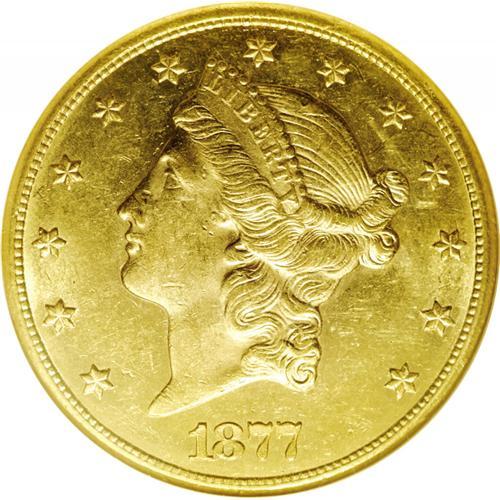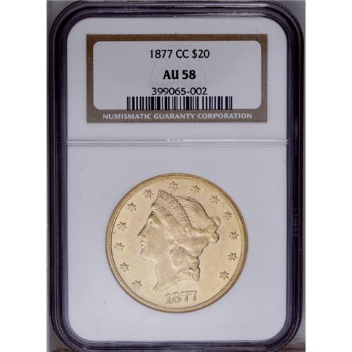 <B>1877-CC $20 AU58 NGC.</B></I> Well defined with an attractive semi-reflective finish that is only interrupted by a hint of scuffiness over the obverse fields. The mintage of this first-year Type Three issue is a comparatively low 42,565 pieces, and true Mint State examples are limited to just a few dozen coins.